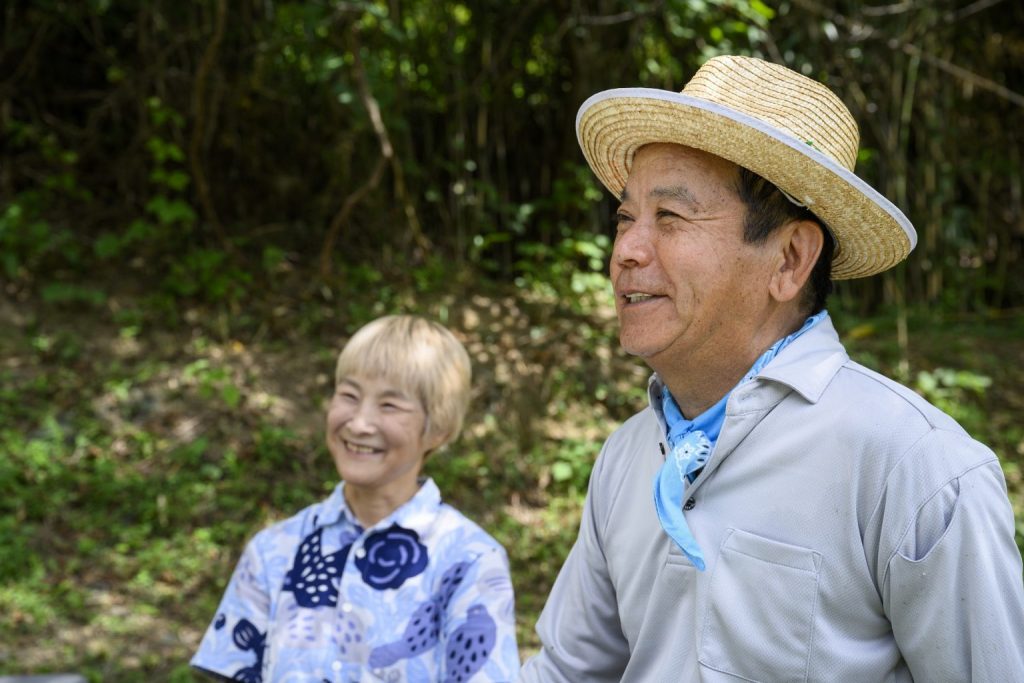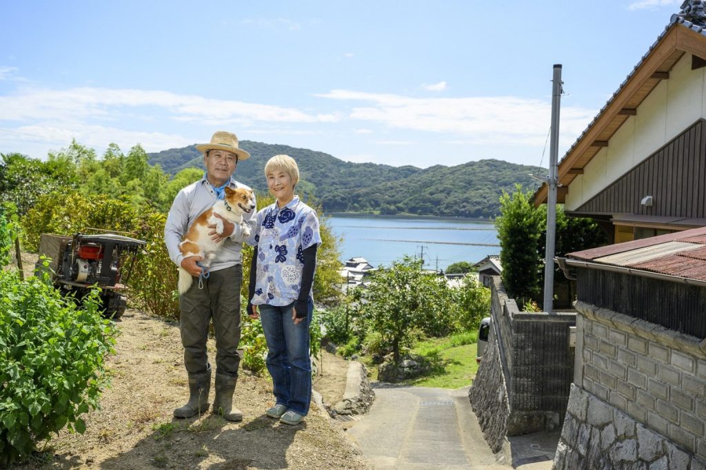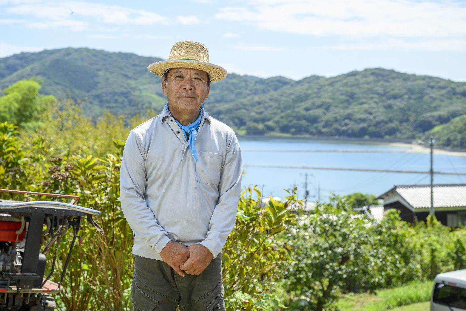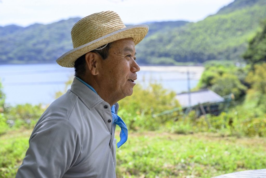 民家の間をぬって細い坂道を上っていくと、眼下にキラキラと揺れながら光る湾、その向こうにはなだらかな山々が見えます。葉の茂る大きな梅の木の下で出迎えてくれたのは夫の利則さん。麦わら帽子の下で日に焼けた笑顔が輝いています。
