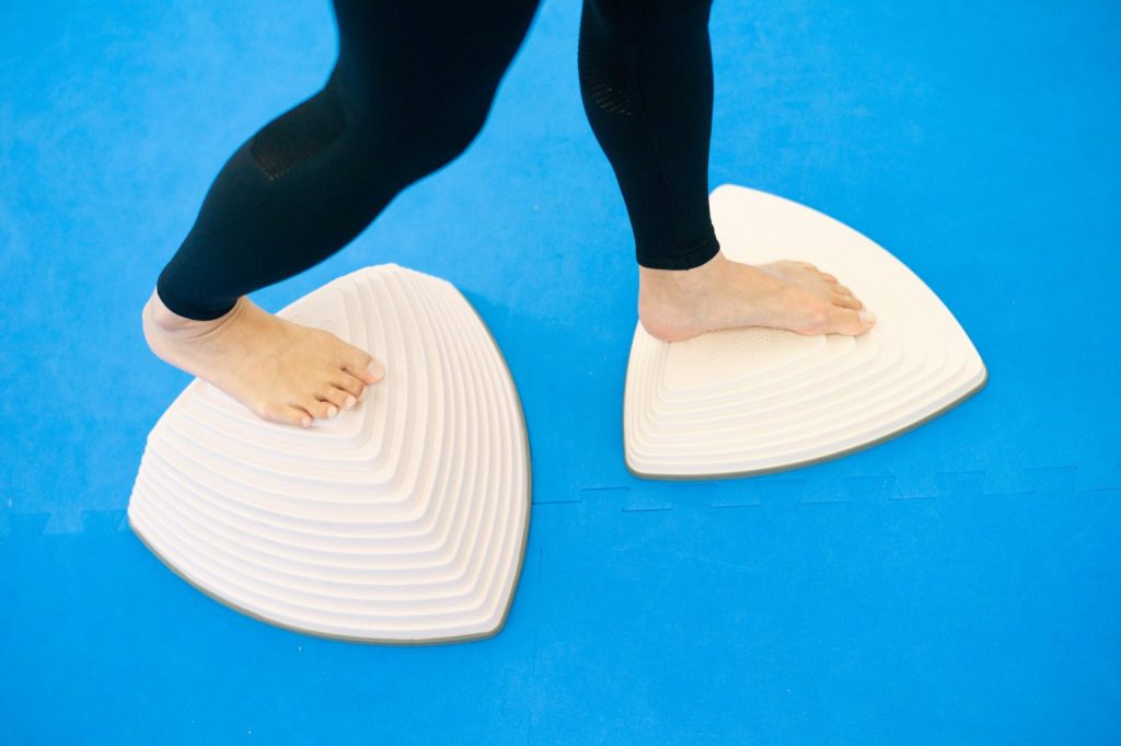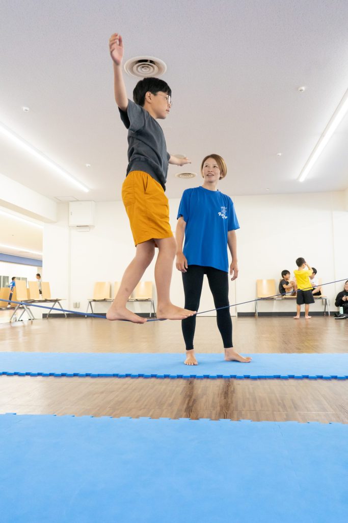 「私が開催した講座にたまたま参加していたのが、プロクライマーの三由 野(みよし なお)さんでした。三由さんは日本におけるハイライン(高所綱渡り)の第一人者。命綱なしのハイラインの日本記録を樹立した人です。お互いにハダシでの活動ですし、同じ子育て世代。話を聞けば聞くほど面白い人だなって。すぐに意気投合して、ストレッチポールやスラックラインを組み合わせた、安全性の高い運動機能向上プログラムを一緒に開発していくことになったんです。」