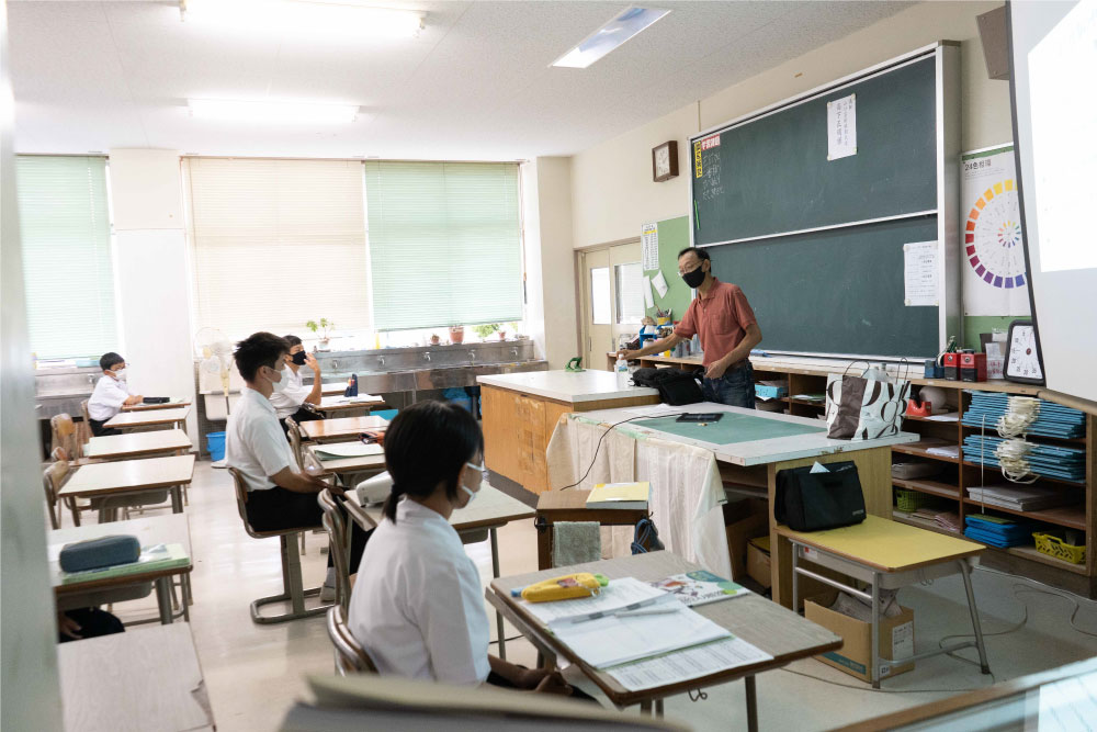 秋雨が通り過ぎたある日の午後、周陽中学校で開催された「働く人に学ぶ会」の授業にお邪魔しました。クリエーター領域の講師を担当したのは、「ラボ・コンタンポラン」を主宰する高下正明さん。映像クリエーターとして作品づくりに取り組みながら、子どもを対象とした美術・デザイン・プログラミング教室やワークショップを展開しています。