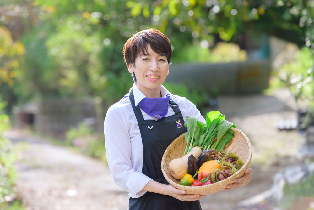 1974年、周南市戸田生まれ。高校卒業までを自然豊かな戸田の苔谷地区で過ごし、大学進学のため福岡県へ。卒業後はUターンし、アパレル業界に就職。結婚・出産を機に専業主婦となり、シチューのテレビCMをきっかけに野菜ソムリエという資格を知る。子育ての合間に猛勉強し、2011年に野菜ソムリエを、2020年には野菜ソムリエ上級プロを取得。「野菜は体の栄養に。ヤサイコトバは心の栄養に」をコンセプトに自ら考案した「ヤサイコトバ」を使って野菜の魅力や商品のPR活動をし、2021年、「第10回野菜ソムリエアワード」の最高賞である金賞を受賞。道の駅ソレーネ周南の地産地消レストラン「ベーカリーキッチン菜」でシェフを務めるほか、KRY熱血テレビ「いろどりRecipe」のレシピ考案や、イベントや各種講座、料理教室を全国各地にて開催するなど多岐にわたり活躍中。