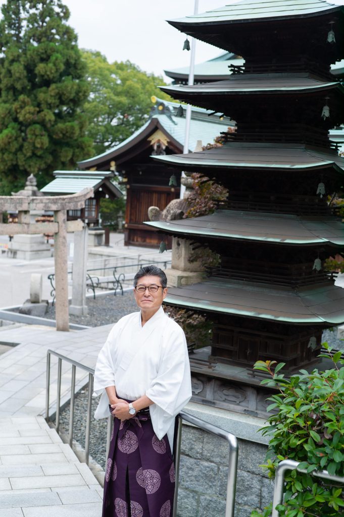 1962年、周南市生まれ。徳山高校を卒業後、國學院大學文学部神道学科で神職資格を取得。京都の石清水八幡宮に神職として務めた後、平成元年に禰宜(ねぎ)として実家である遠石八幡宮へ。その後、平成27年から第57代宮司に就任。