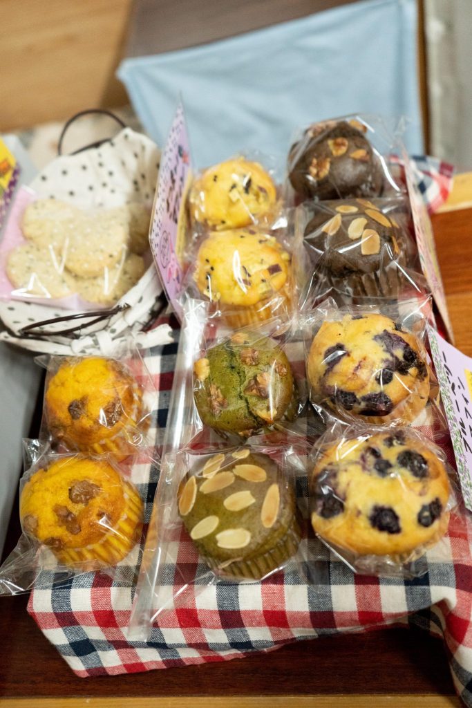 「マフィンは約10種類。ブルーベリーは瞬間冷凍させたものを使っています。生のブルーベリーを使用するよりもうまく焼き上がるんです。抹茶やほうじ茶マフィンには、きび糖で作った自家製あんこや砂糖を使っていない発酵あんこが入っています。季節の野菜や果物を使って、できるだけ体にいいものを提供したいと思っています。」
