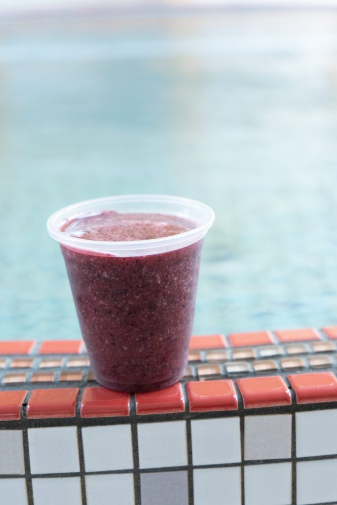 「ブルーベリースムージーは水素水入り。注文が入ってから作るので、いつでも出来立てのおいしさを楽しんでいただけます。お風呂でさっぱりした後、体に良いものを飲んで、元気になってもらいたいです!」
