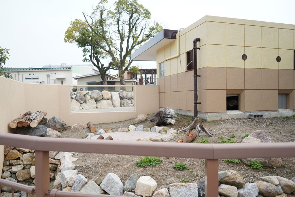 次に向かったのは、鋭い針を背中にたくさん抱えたヤマアラシの飼育場。高低差のある地形を活用し、西側は柵なしで観覧することが可能に!東側には、小さな子どももヤマアラシを間近で観察できるガラスビューが採用されていました。