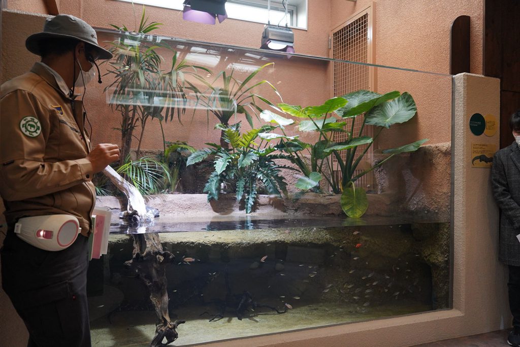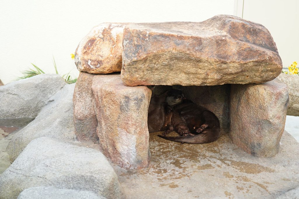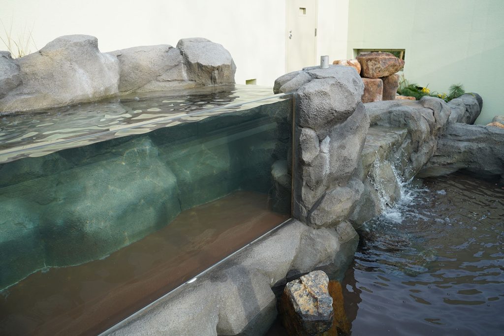 そこにいたのは、コツメカワウソ。深いプールから滝のように浅いプールに水が流れる構造にすることで、コツメカワウソが遊べる空間を作り出し、水中と陸上で活発に動き回る姿を見ることができるようになります。