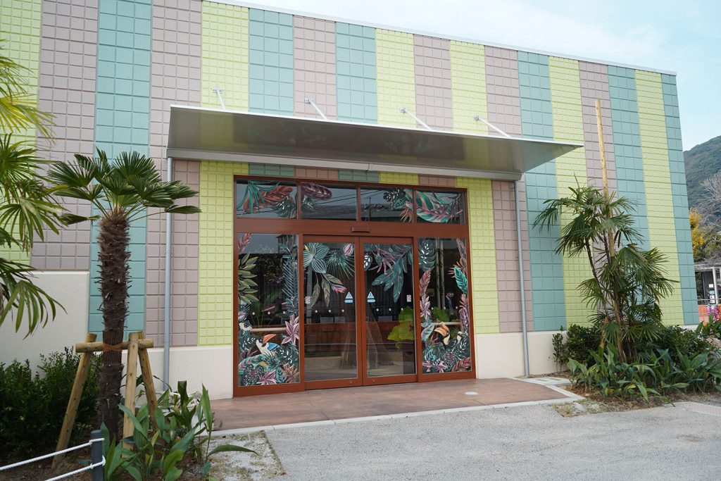 次は、カラフルな外観の、熱帯いきもの館「太陽と水の森」です。建物は、デザインパネルや色彩で、爬虫類のうろこを表現しているんだとか。